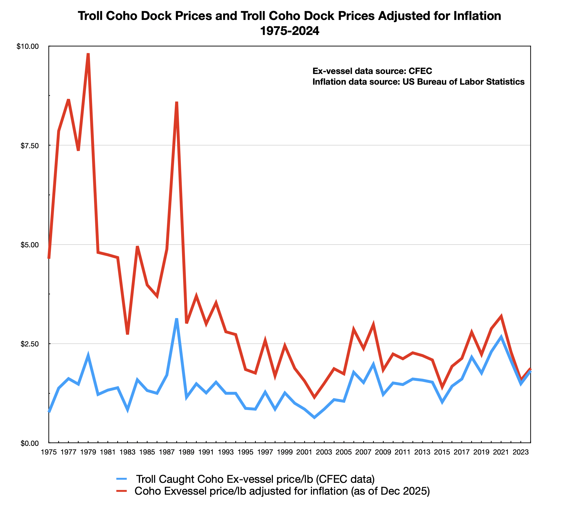 The chart above shows the last 50 years ex-vessel pricing/lb for SE troll caught coho from 1975-2024. The blue line is ex-vessel price and the red line shows ex-vessel price adjusted for inflation.